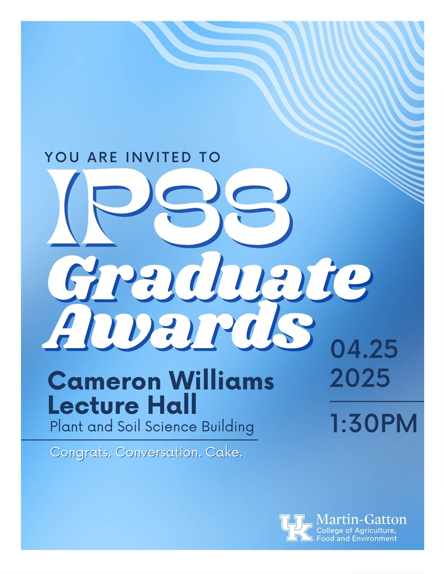 The IPSS Graduate Awards were held in the Cameron Williams Lecture Hall to celebrate and acknowledge the accomplishments of the program's students. Awards were presented by Dr. Ole Wendroth, Dr. Erin Haramoto, and Dr. Bruce Downie.